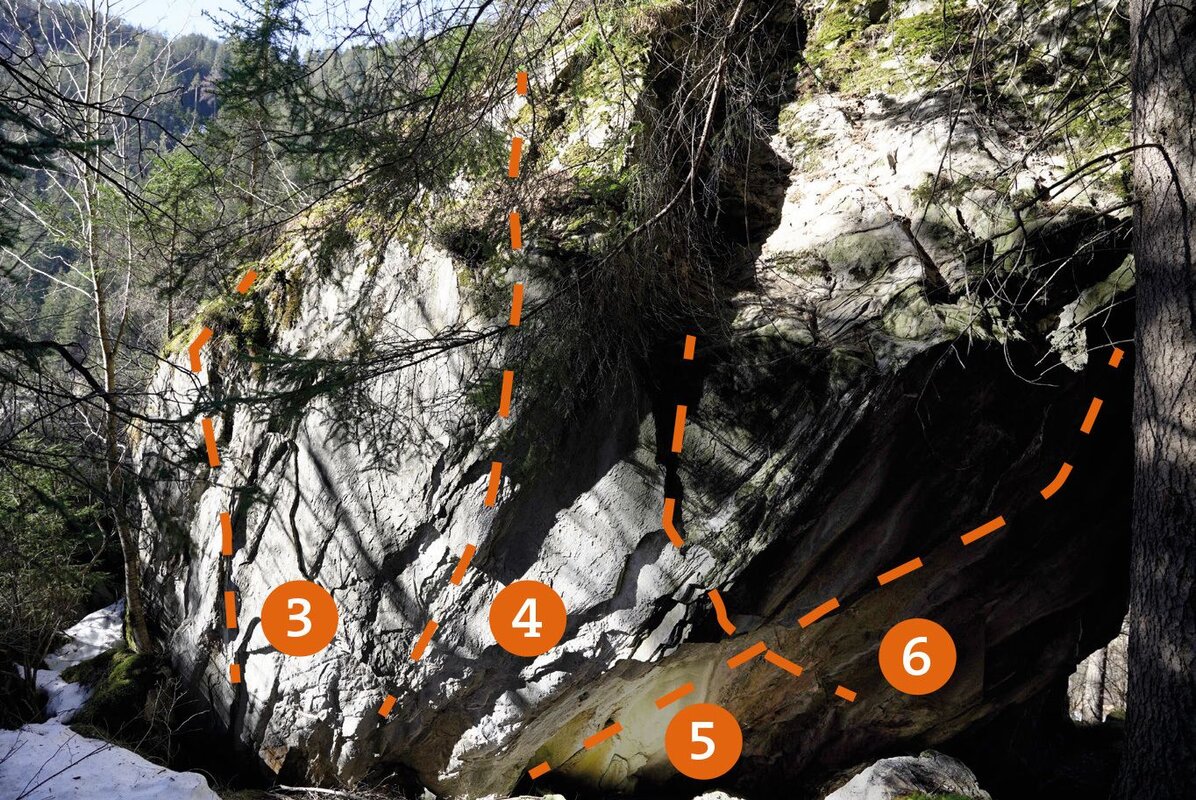 Bei diesem Block sind 6 Boulderprobleme mit einer Schwierigkeit von 5b bis 7a zu bewältigen.