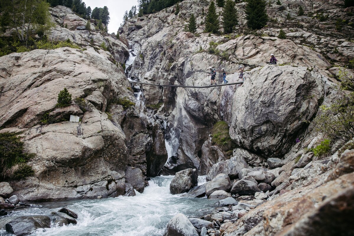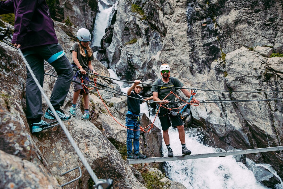 Über geschliffenen Gletscher-Glimmer-Gneis beginnt der Einstieg beim imposanten Wasserfall Rifflbach – im Fernergries. Beginnend links vom Wasserfall überquert man über eine Brücke den tosenden Bach und klettert dann immer entlang des Wasserverlaufs weiter über Platten bis zu einem kleinen „Boden“, bei dem man sich kurz ausrasten kann. Der 2. Teil verläuft über ein Steilstück kurz rasant in die Höhe bis man dann das Ende des Klettersteigs beim sogenannten „Schnapsloch“ erreicht.