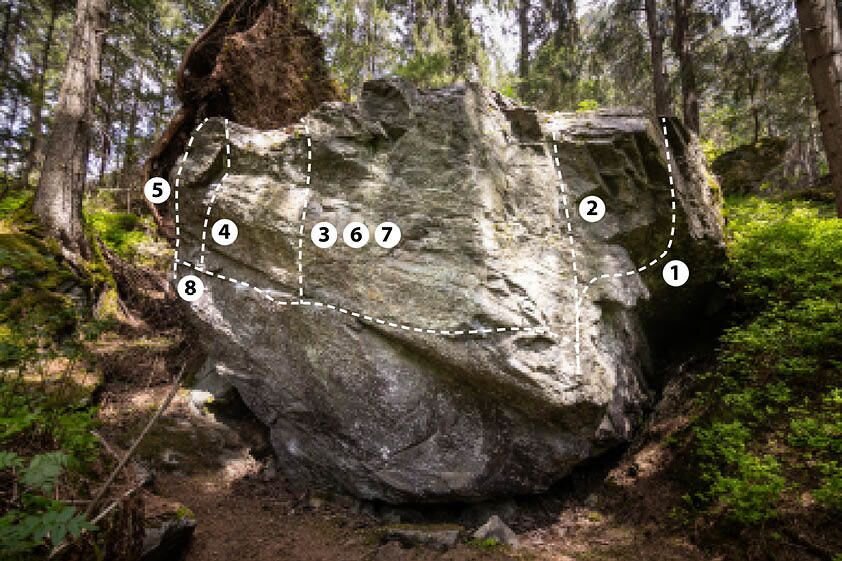 Bei diesem Block bewältigt man 8 Boulderprobleme mit einer Schwierigkeit von 6a+ - 7b.