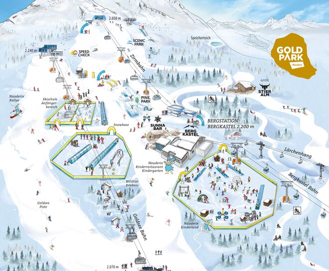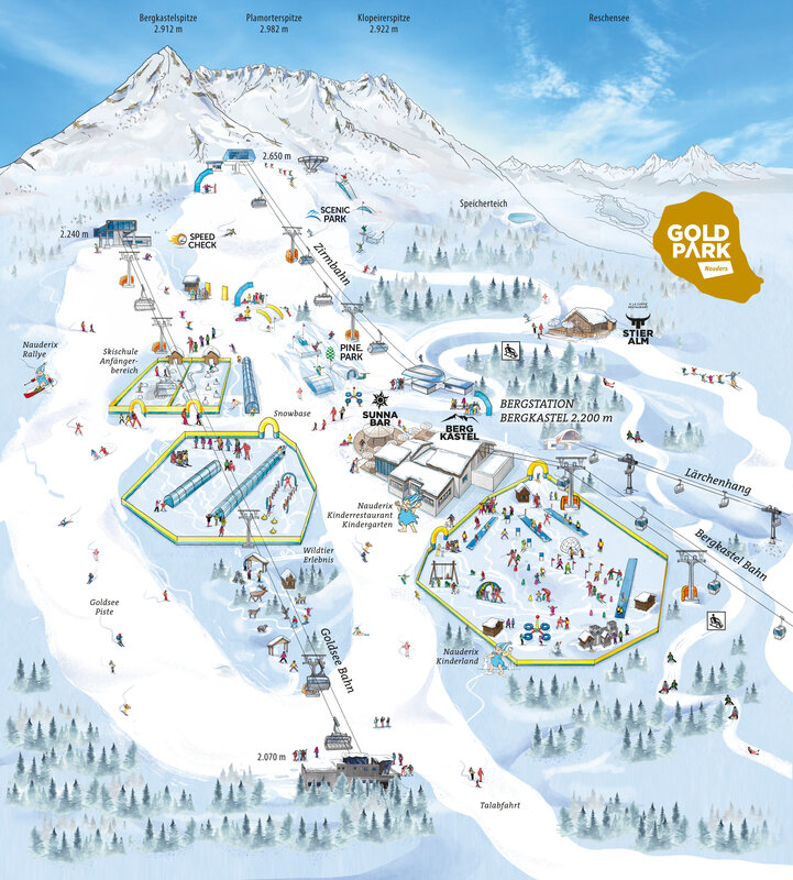 Zum neuen Goldpark gehören neben der neuen Goldseebahn mit dazugehöriger Goldseepiste die neue Snow-Base Bergkastel sowie das Nauderixland. Das neue öffentliche Areal am Bergkastel ist mit zwei hochmodernen, überdachten Förderbändern ausgestattet und eignet sich besonders gut für Anfänger und Einsteiger.