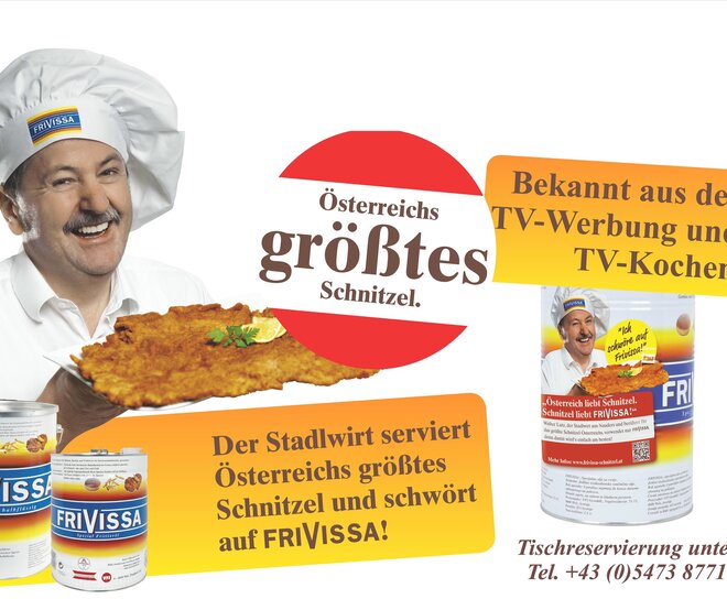 Genießen Sie echte Tiroler Gastlichkeit beim Stadlwirt. Lassen Sie sich von der grandiosen Natur beeindrucken, die uns hier in Nauders umgibt. Eine Große Auswahl an Speisen erwartet Sie beim Stadlwirt! Genießen Sie das größte Schnitzel Österreich´s im Stadlwirt oder bei Ihnen zu Hause! Zum Mitnehmen erhalten Sie einen speziellen Karton. Ihr Riesenschnitzel können Sie täglich ab 16 Uhr telefonisch (05473/87710) bestellen und dann beim Stadlwirt abholen. Sie können natürlich auch einfach vorbeikommen und ein paar Minuten warten, bis der Stadlwirt Ihr Schnitzel zubereitet hat!