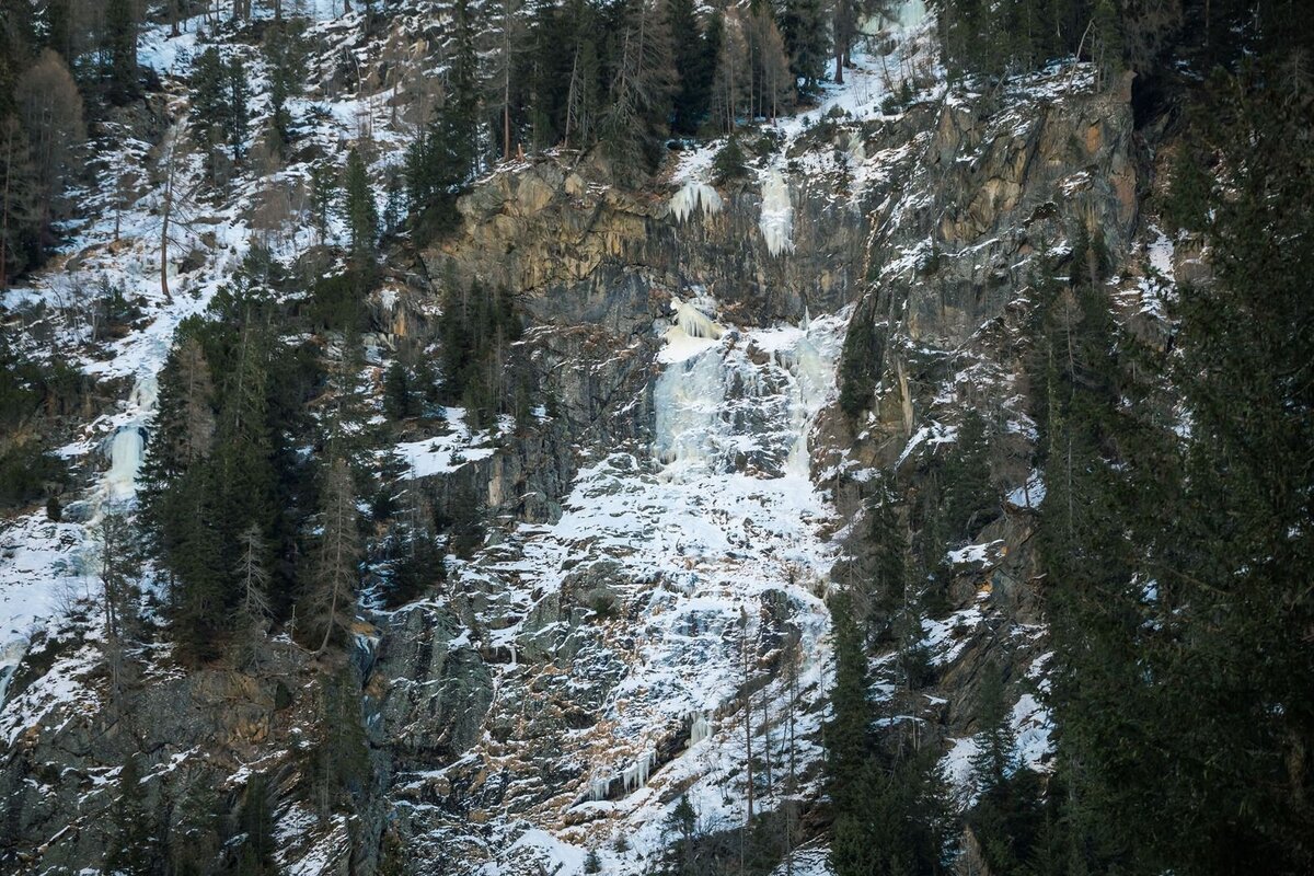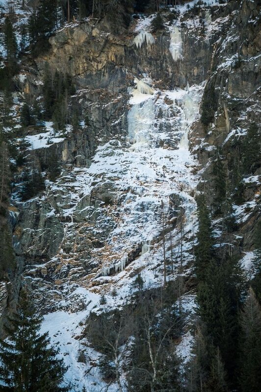 Zustieg: Von der Straße über ein offenes Feld mit Heustadel ca. 15 min. unter das große Eisschild.