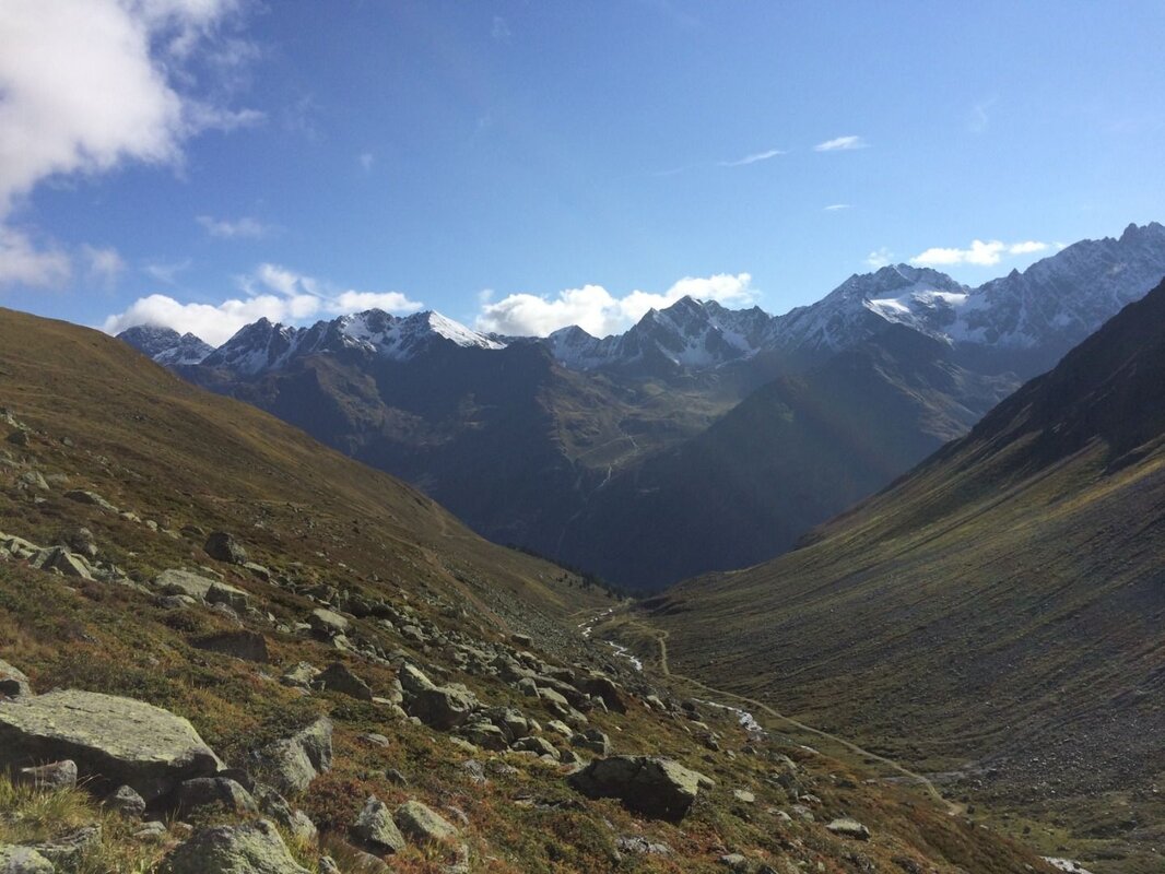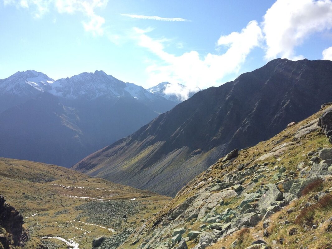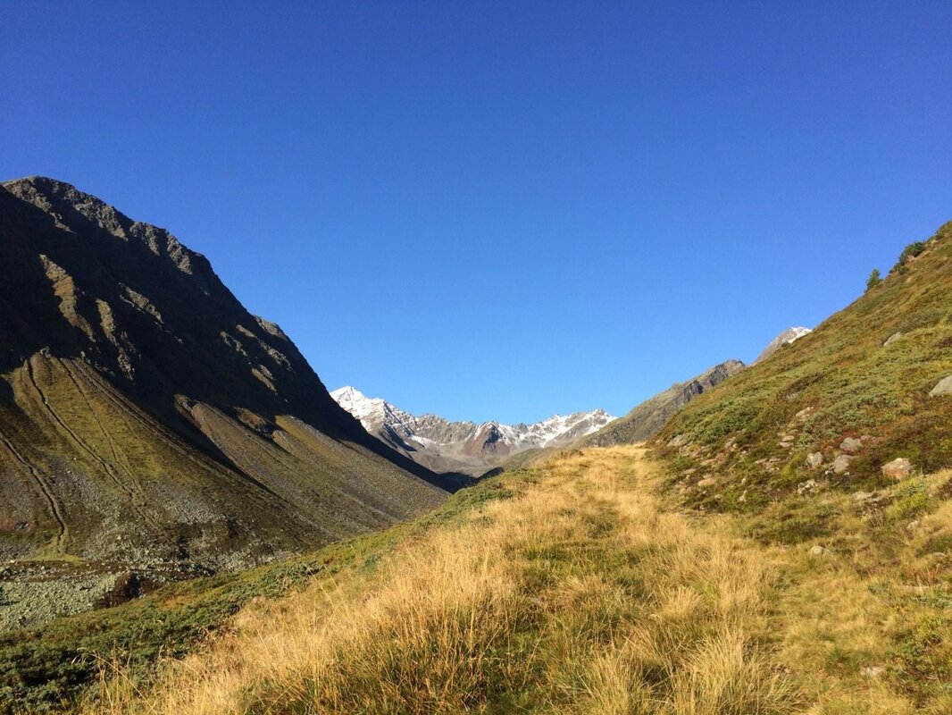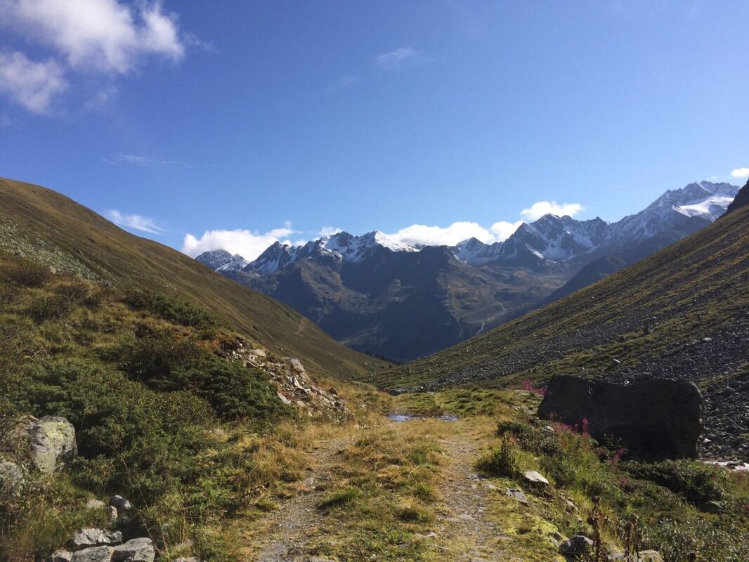 Bei den markierten Felsblöcken am Ablauf des Sees beginnt der Abstieg. Nach den Blöcken folgt man dem Steig, welcher auf dieser Seeseite etwas stärker ausgetreten ist, bergab. Der Weg quert den Hang zuerst noch etwas weiter nach rechts ins Tal hinein, bevor er direkter abwärts leitet und dann schließlich auf den Karrenweg trifft. Am Bach angekommen, folgt man dann dem Karrenweg nach links. Jetzt schlendert man gemütlich talwärts, mit bester Aussicht auf die Hapmesköpfe (3.237 m), den Wurmtaler Kopf (3.228 m) und die Bligg Spitze (3.454 m) am gegenüber liegenden Kaunergrat. Über den leicht abfallenden Karrenweg gelangt man zurück bis zum Ausgangspunkt an der Nassereinalm, wo Buttermilch und eine Almjause wieder Energie spenden.