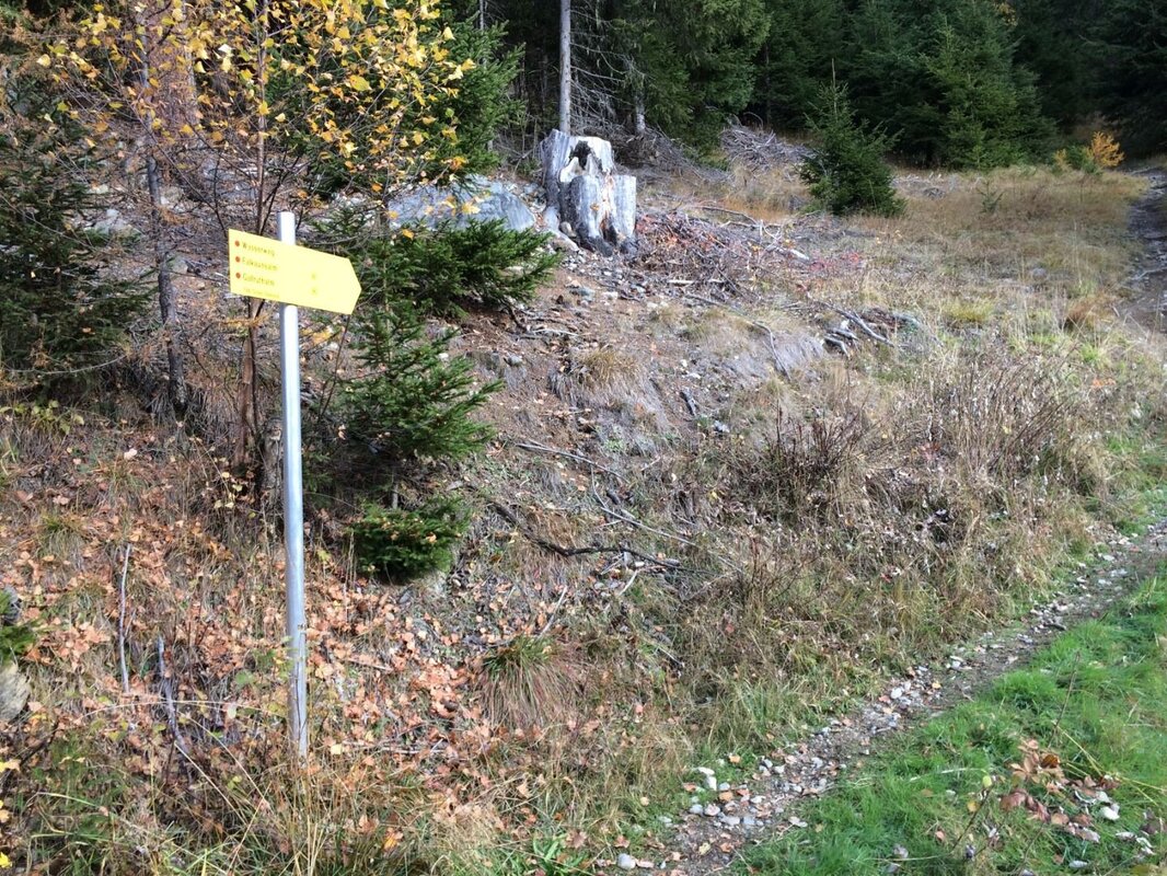 Wer an der Abzw. „Wildfütterung“ lieber am Forstweg bleibt, folgt hier der Beschilderung in Richtung „Wiesenhof“ und erreicht auch über diesen Weg den Ausgangpunkt. Dabei wandert man jedoch ausschließlich durch den ausgedehnten Fichtenwald und versäumt dabei den landschaftlich abwechslungsreicheren und sehr schönen Abschnitt entlang der Bergwiesen oberhalb des Wiesenhofes.