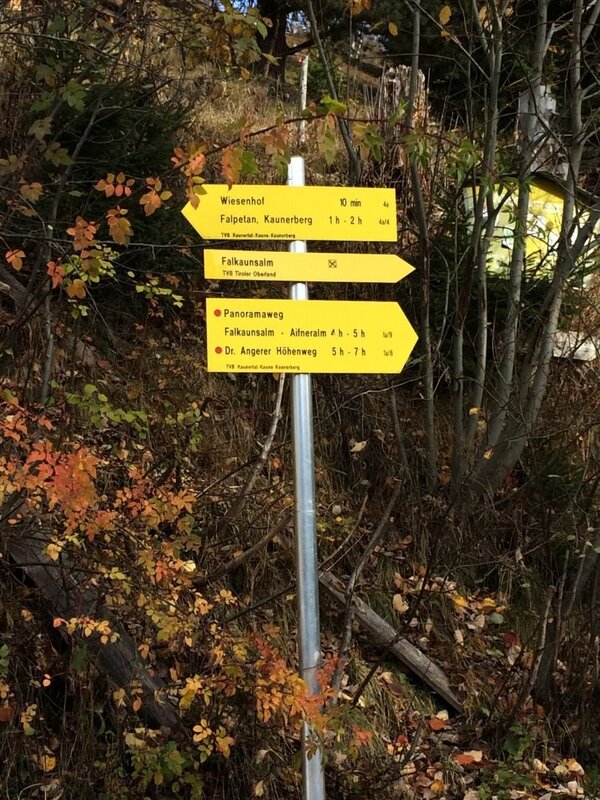 Der Ausgangspunkt dieser genussvollen Wanderung liegt in der letzten Kehre unterhalb des Wiesenhofs auf 1.560 m an der Abzweigung des Forstweges, welcher zur Falkauns Alm führt. Hier gibt es eine kleine Parkbucht, in der das Auto abgestellt werden kann. Man folgt der Beschilderung zum Wiesenhof nach links und erreicht bereits nach wenigen Minuten diesen wunderschön gelegenen Hof. Hier beginnt ein Forstweg, auf welchem man schöne, artenreiche Wiesenflächen quert und die fabelhafte Aussicht ins Kaunertal genießen kann. Diesem Weg folgt man bis zur Abzweigung „Oberfalpetan, 1.630 m“. Nun hält man sich rechts in Richtung Falkauns Alm und wechselt gleich nach der Kurve auf den Steig.
