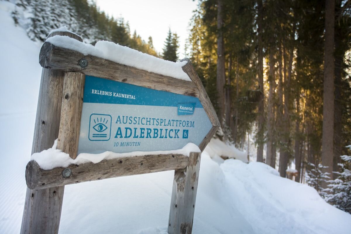 Die Aussichtsplattform Adlerblick ist erreichbar über den Winterwanderweg in Richtung Verpeilalm. Sie wandern von Feichten durch den Ortsteil "Mühlbach" am Ferienhotel Lärchenhof vorbei in Richtung Verpeilalm. Romantisch geht es entlang dem Forstweg weiter durch den verschneiten Winterwald. Die Strecke steigt stetig an und ist ca. 3,2 km lang (ein Weg). Es werden ca. 370 Höhenmeter zurückgelegt. Für den Ansteig wird man dann mit einem atemberaubenden Ausblick über Feichten und das Kaunertal belohnt.