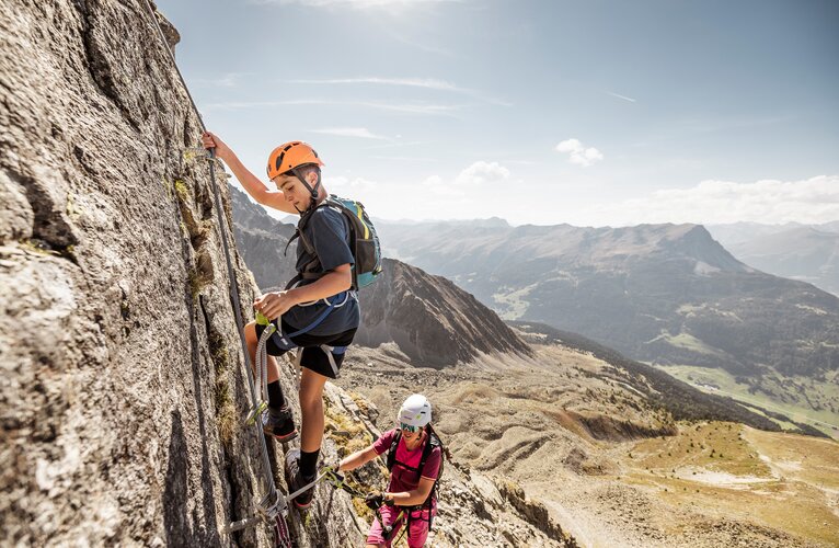 Wer höher hinaus will und gern klettert, dem sei noch der neue Goldgrat Klettersteig ans Herz gelegt. Der vermittelt auf fünf Stationen die wichtigsten Basics für das Klettersteiggehen. Die Goldgrat-Route auf die 2.912 Meter hohe Bergkastelspitze ist der erste hochalpine Klettersteig-Lehrpfad der Alpe. Anfänger können auch nur bis zur Goldpitzl klettern.