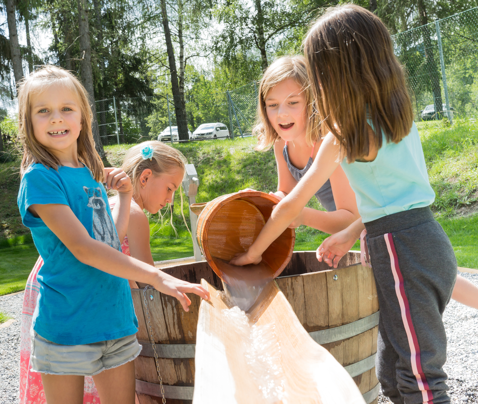 Willkommen am Wasserkraft-Spielplatz am Badesee Ried. 8 Erlebnisstationen warten auf euch!