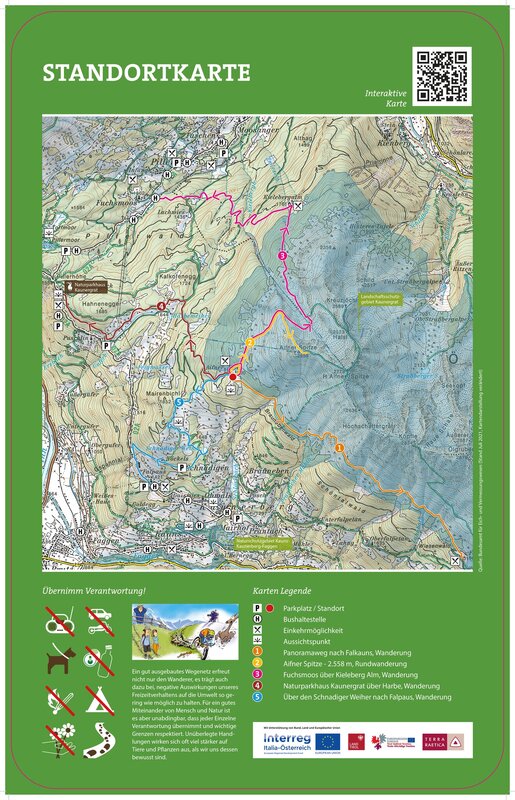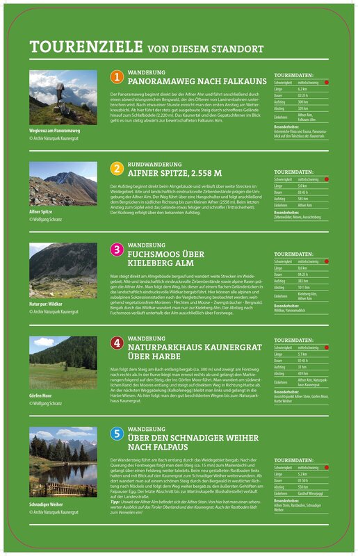 Von der Aifner Alm starten fünf abwechslungsreiche Routen: der Panoramaweg nach Falkauns, der Aufstieg zur Aifner Spitze, der Weg über die Kielebergalm nach Fuchsmoos, die Route zum Naturparkhaus Kaunergrat über den Harbe Weiher und der Abstieg über den Schnadiger Weiher nach Falpaus.