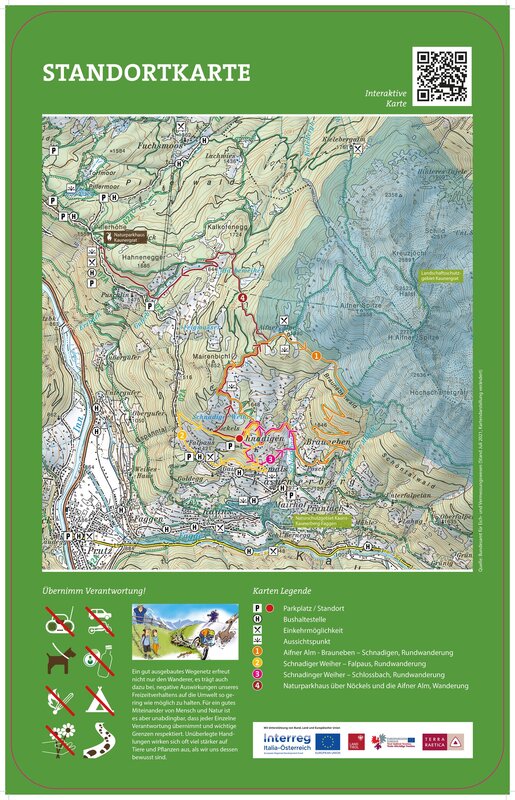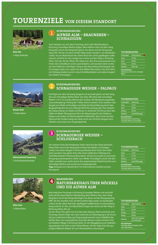 Vom Schnadiger Weiher aus starten mehrere abwechslungsreiche Rundwanderungen, die unter anderem zur Aifner Alm, nach Brauneben, nach Falpaus oder zum Schlossbach führen. Eine weitere Möglichkeit führt zum Naturparkhaus über Nöckles und die Aifner Alm.