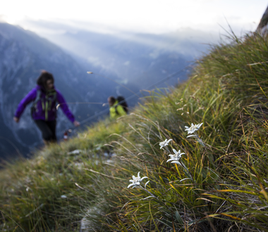 The alpine shuttle takes us from the village centre in Nauders to the Labaunalm, at 1,977 metres. Once at the top, we climb together to the Bazahler Köpfe and hike on through the flowering mountain meadows to the Fluchtwand. There we are greeted by the queen of the alpine flowers - the alpine edelweiss.