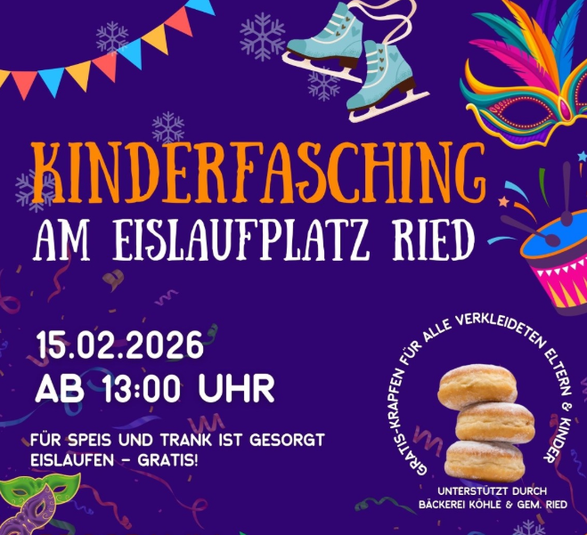 Ice skating is free, and a DJ will provide lively music to ensure a great atmosphere. Of course, food and drinks will also be available. A special highlight: all children and parents in costume will receive free doughnuts – sponsored by the Köhle bakery and the municipality of Ried.