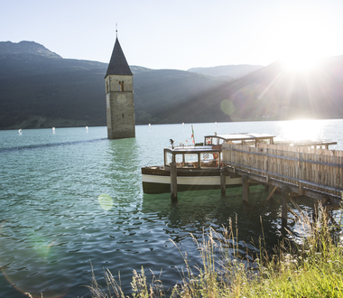 Water lovers who might also like to swim across the border to South Tyrol, will come across a huge “bathtub” by way of a man-made reservoir – complete with church steeple rising up out of the water.