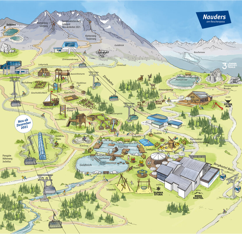 The Goldwasser adventure world is located right next to the Bergkastel mountain restaurant at the mountain station of the Bergkastel cable car. Right next to the Goldwasser is the Sunnastuba/Sunnabar with sun terrace as well as the Goldbike Park, Zirmbahn & Goldseebahn and much more.