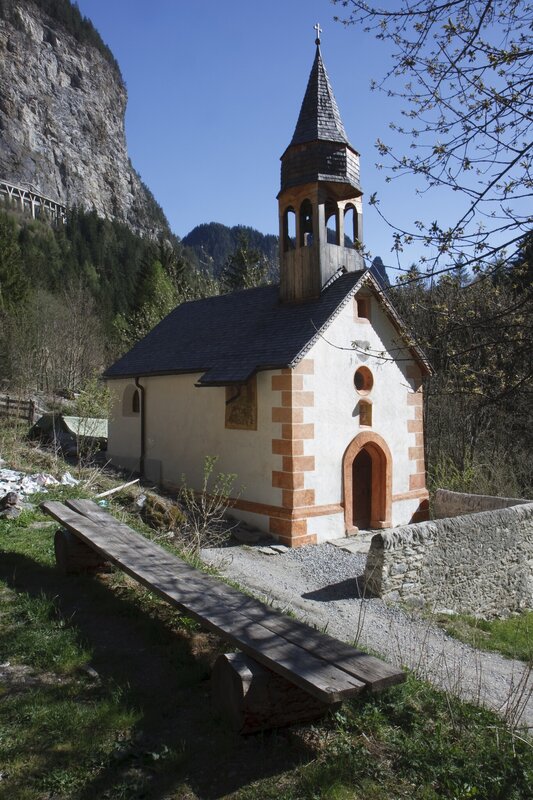 Slightly to one side, south of the gate tower stands the small chapel dedicated to the Ascension of Mary, which was built in gothicised style in 1604. The three bay structure is rounded off by a round apse, and is fitted with a wooden pavilion rook and heavy wooden ridge turrets. On the western outer wall there is a fresco depicting the crucifixion. The chapel boasts an altar by Andreas Thamasch, the most important sculptor in Tyrol of the High Baroque period.