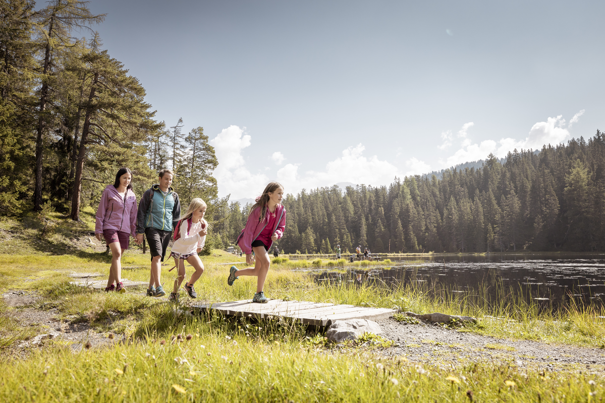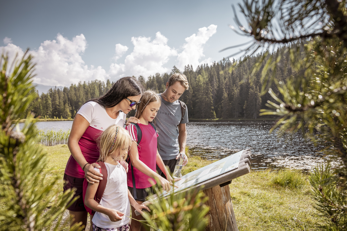 After the ascent with the double chairlift Mutzkopf, hiking trail no. 9 leads to the entrance of the nature trail and this then continues via hiking trail no. 9b to the Schwarzensee. The lake trail leads along the shore of the jet-black lake, providing insights into the flora and fauna around the Schwarzensee. The trail continues via Losschrofen and the Pflanzgarten towards the valley. The Waalweg leads you further towards Nauders and back to the Mutzkopf valley station.