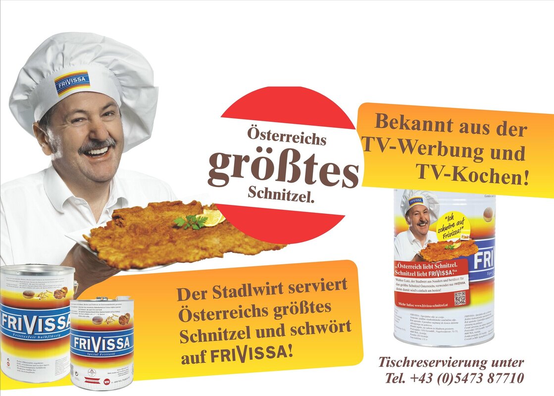 Enjoy real Tyrolean hospitality at the Stadlwirt Let the magnificence of the nature around us here in Nauders amaze you. A wide selection of meals awaits at the Stadlwirt! Enjoy Austria’s biggest schnitzel at the Stadlwirt or at home! For take away, you get your schnitzel in a special box. You can order your giant schnitzel daily from 16.00 by phone (05473/87710) and then collect it form the Stadlwirt. Or you can, of course just come by and wait a few minutes for the Stadlwirt to prepare your schnitzel!