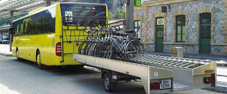 4 times daily (sometimes only from Pfunds) trailer with capacity for 16 bikes. In addition, up to 5 bikes for all other departure times of the lines 210 (now also e-bikes).