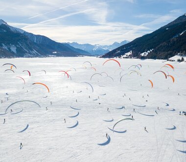The Reschensee or the Haidersee only some kilometers behind the Reschenpass offer perfect conditions for snowkiting in winter. With the stunt kite you go with skis or a snowboard fast across the ice.