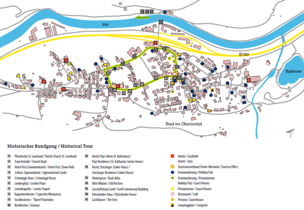 Bilingual information boards (English and German) were placed at a total of 22 stations, including the parish church of St. Leonhard, Sigmundsried Castle and the Fasslbrunnen. 17 locations are located directly in Ried. Off the village tour there are also five outposts, such as the grain mill, the sawmill and the Inn bridge.