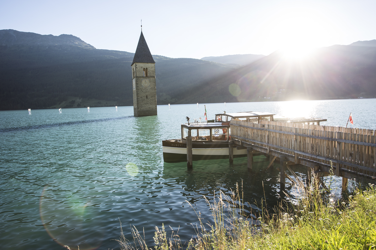 The church tower, which rises directly from the water of Lake Resia in nearby Italy, is a must-see. The reservoir has a moving history, which also invites you to water sports.