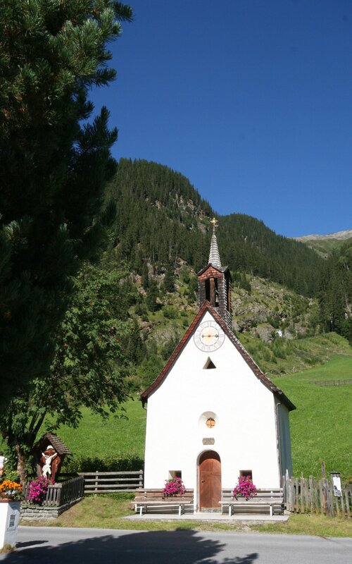 The 32 m2 chapel erected in honour of the “Mater dolorsa” stands on plot 11 in Weiler Nufels (1,275 m above sea level). It is owned by the four Nufels farmers: Hans Peter Hafele, Winfried Penz, Anton Wille and Helmut Stadlwieser. The settlement was named in records from 1440. In 1781 a Way of the Cross was even set up to the chapel. On 22 February 1999, the Gallruth avalanche just passed by the chapel. The owners carried out renovation work from 1998 to 2000.