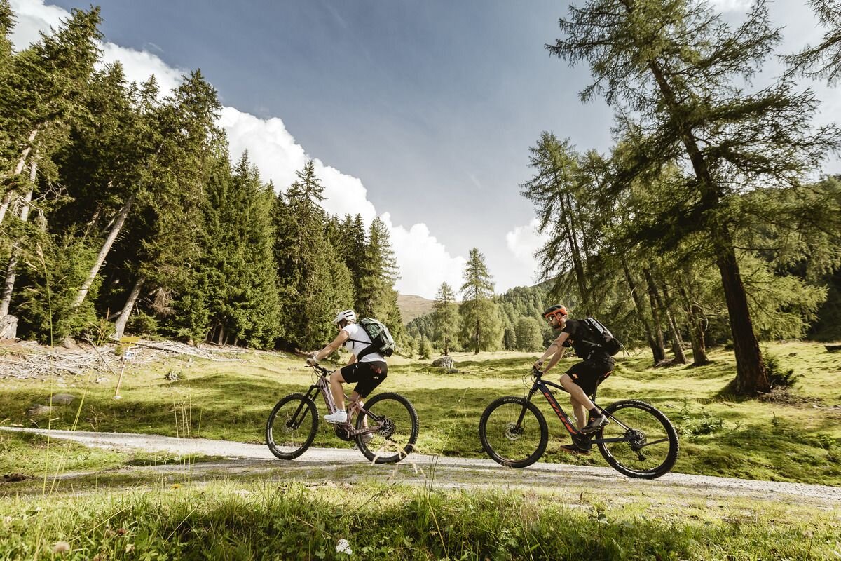 A wonderful, but also challenging MTB tour through the breathtaking forests of the Radurschltal valley. From the starting point in Pfunds, you leave the cycle path and head straight uphill towards the Ulrichskapelle chapel. In the shelter of the trees, this tour is a pleasure even in midsummer and provides sufficient cooling on the 800 metre ascent. The forest path meanders along the slope into the valley to the valley crossing, where you leave the Pfundser Tschey on your left and follow the Radurschlbach stream. The forests become thinner and more and more mountain meadows appear the further into the valley you go, making this tour a real nature experience. At the highest point at around 1800 metres, the Radurschlalm is quietly located, where exhausted bikers can fortify themselves with drinks or snacks. If you still haven't had enough, you can continue your sporting activity on foot to the Hohenzollernhaus or take the same route back to the starting point in Pfunds.
