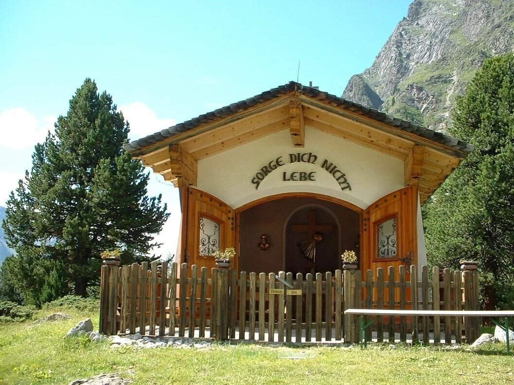The Verpeiltal valley opens up east of Feichten, where an impressive 19 m2 chapel stands near the Verpeil Hut of the German Alpine Association, Frankfurt am Main Section, at 2,030 m above sea level on plot 136/1, the so-called “Schönbödele”. It can be easily reached on foot in 2 hours from Feichten. The German saying above the entrance “Sorge dich nicht- Lebe”, which translated means “Don’t worry - just live” is so simple and inspirational!