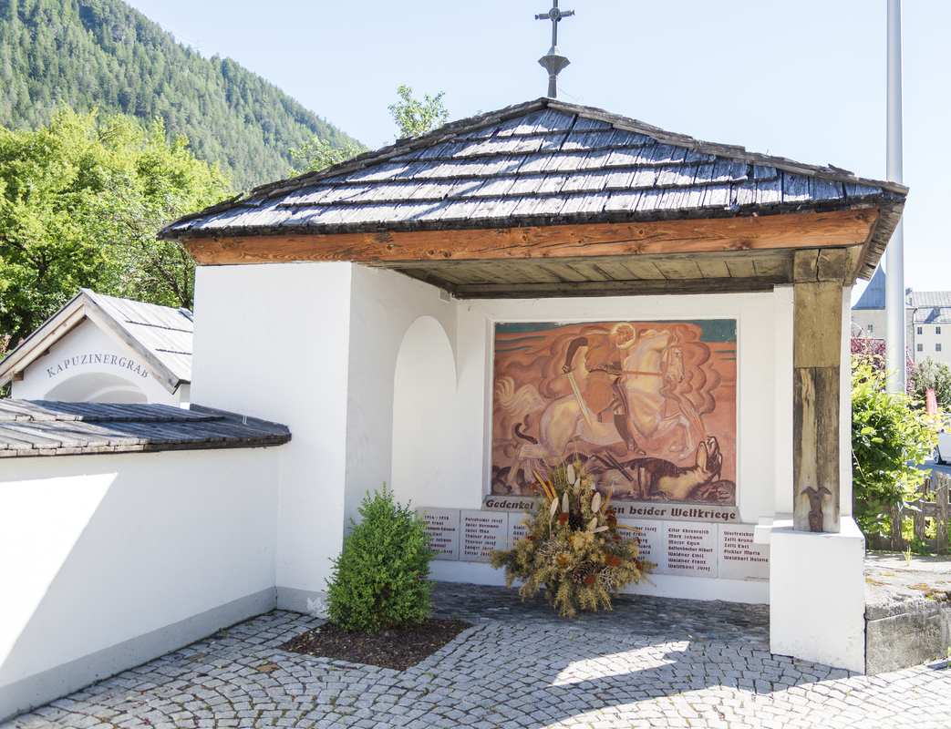 This war memorial was erected to honour the soldiers from Ried who fell in both World Wars The impressive portrayal of “George the Dragon Slayer” in a wall painting is also worth seeing. The fire-breathing dragon symbolises the terror and horror of war.