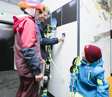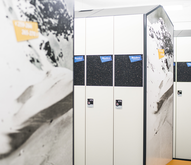 Die Komfort-Skidepots im Seilbahncenter Nauders bieten jede Menge Platz für die Skiausrüstung der ganzen Familie. Ganz nebenbei werden Ski, Stöcke, Skischuhe und Helme auch noch automatisch getrocknet. Das elektronische Schließsystem versperren Sie ganz einfach per Skipass – so ist Ihre Ausrüstung für das nächste Skiabenteuer bestens gesichert!